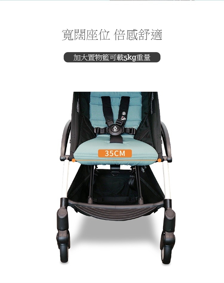 專為初生嬰兒設計的柔軟內墊,讓寶寶外出時亦能舒適安睡。初生睡籃讓寶寶能夠完全平躺,面向父母,更配有 5 點式安全帶,確保路途安全。摺合後的嬰兒車,體積極細