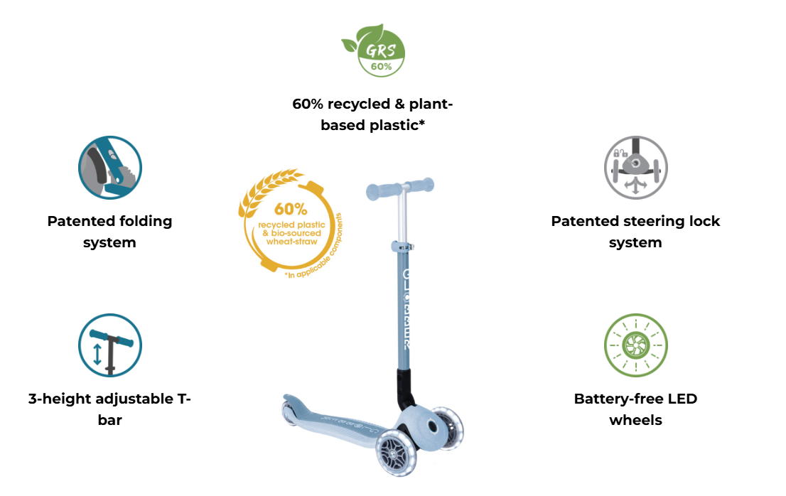 3-wheel scooters for kids (aged 3+) made with 60% recycled plastic and bio-sourced wheat-straw