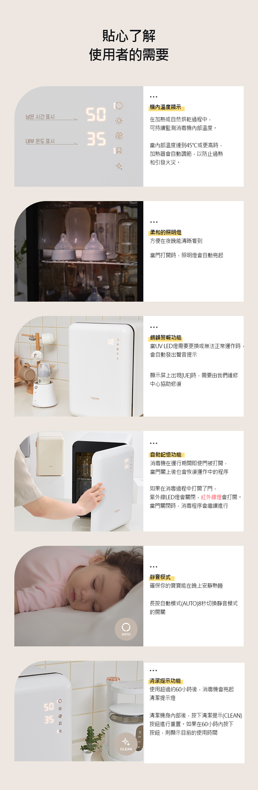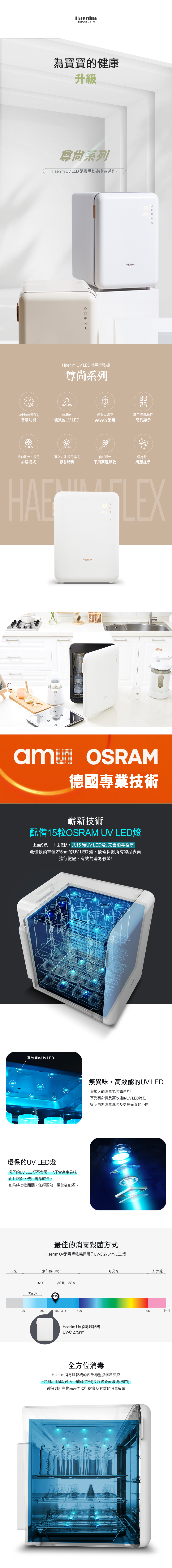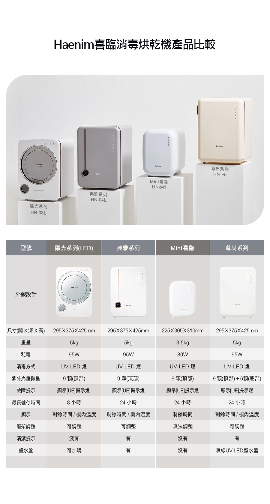 Haenim喜臨UV LED消毒烘乾機(第五代)就像家庭衛生的超級英雄,搭載尖端UV LED技術,能一口氣消滅99.999%的細菌與病毒,讓你的物品潔淨無比!它擁有24小時無菌儲存和智能加速消毒功能,讓你輕鬆享受生活。運作時間顯示功能更是讓你隨時掌握進度,完美適合忙碌的家庭。這款來自韓國的高品質產品,不僅功能強大,還擁有時尚外觀,是每個家庭健康的小夥伴,輕鬆守護家人的健康!