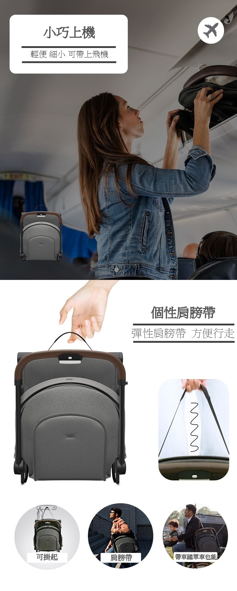 重量僅6.5公斤,收摺後體積小巧 (53.5 x 45 x 21.5 cm),可作為手提行李登機 (建議先與航空公司確認),附有一體式肩帶,攜帶更方便。