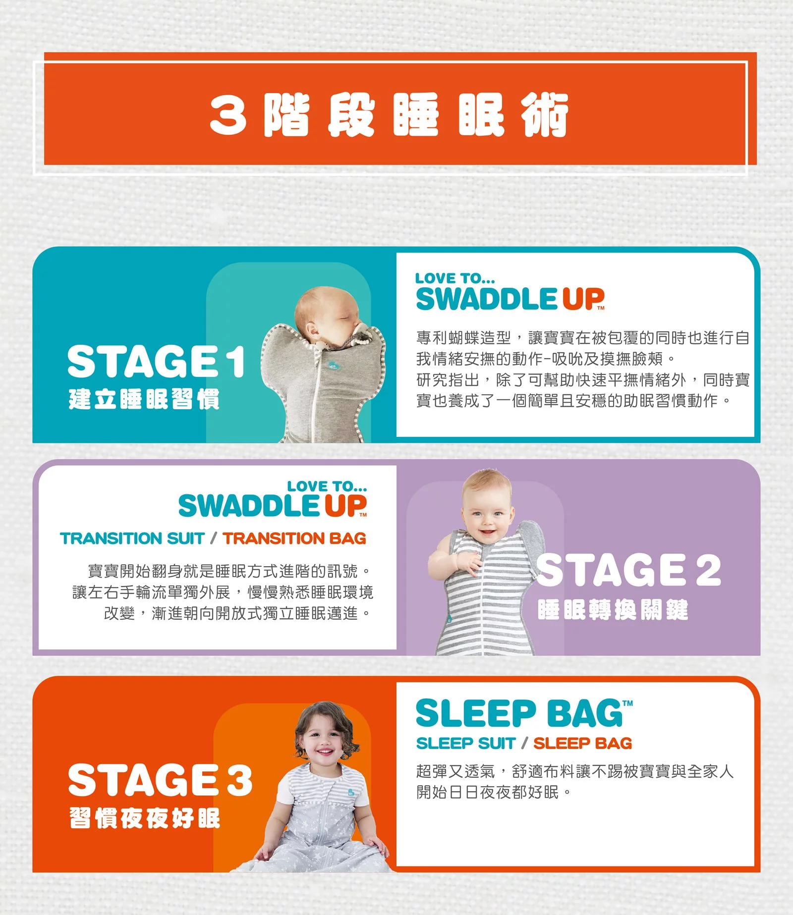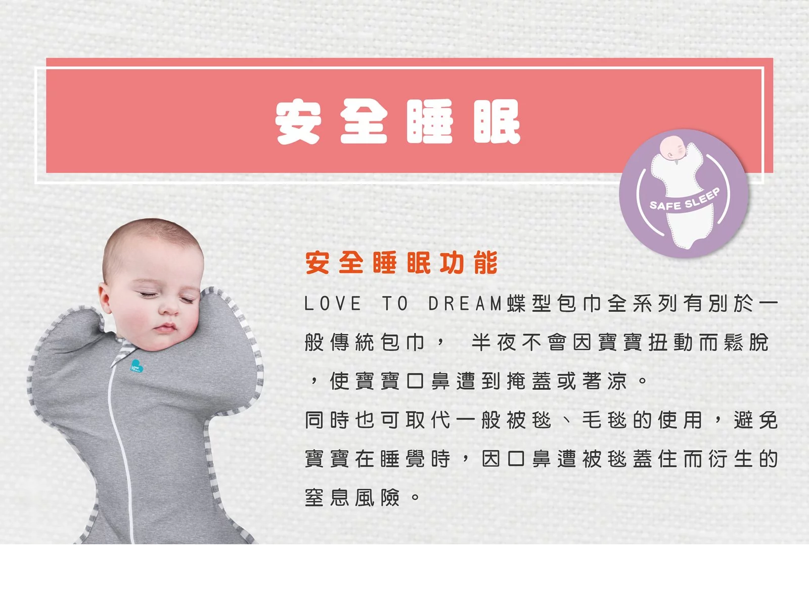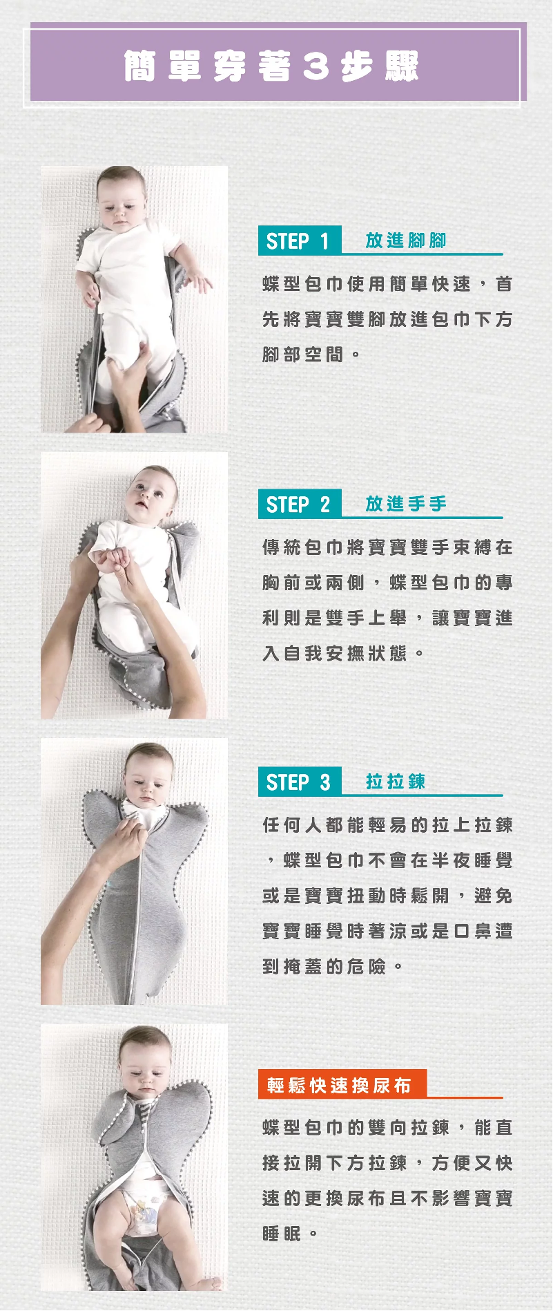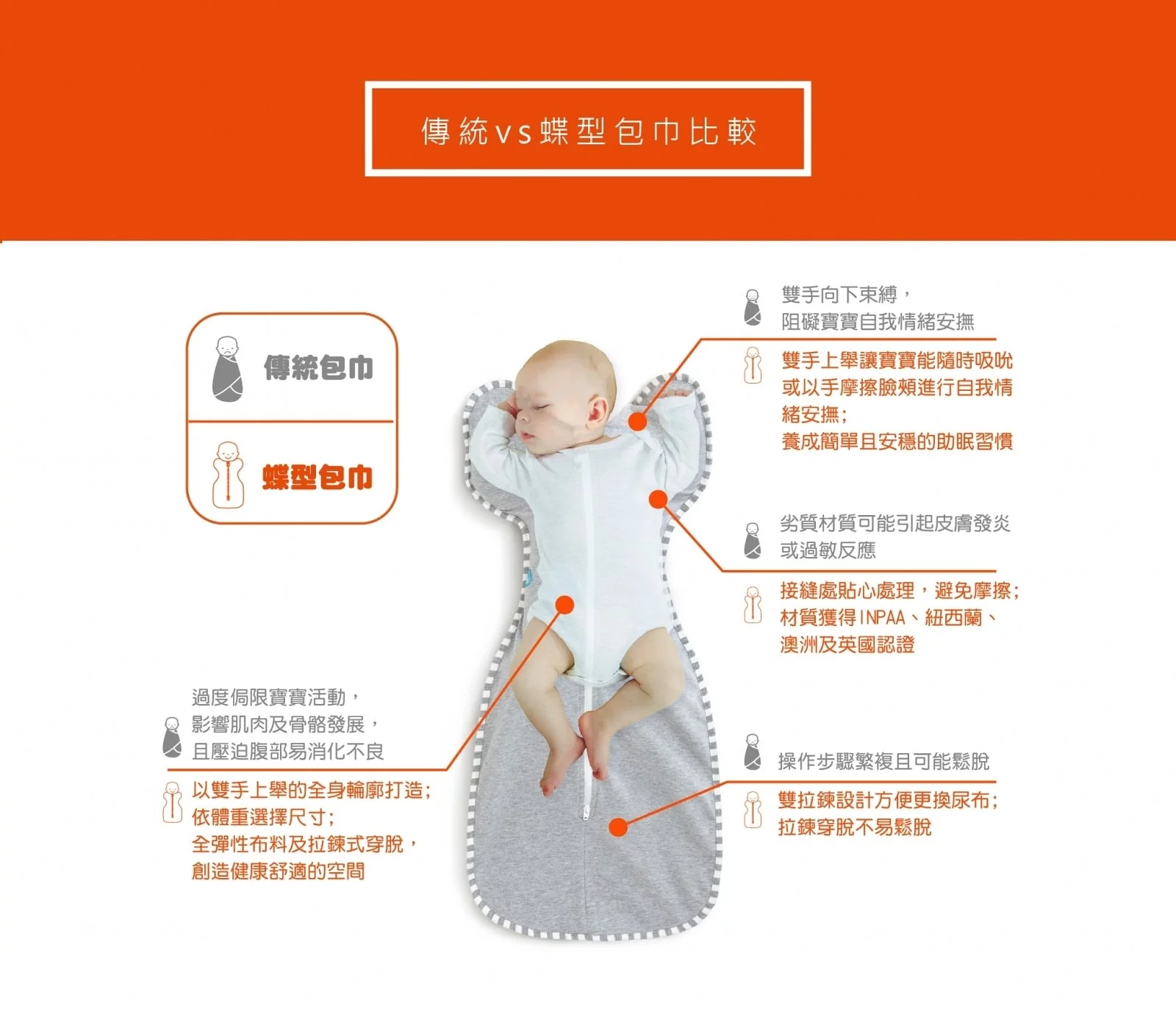 - 貼身剪裁,鎮定驚嚇反射,助寶寶安睡。