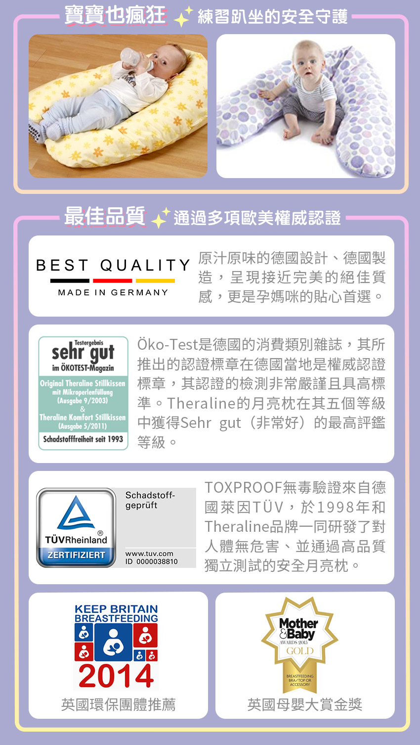懷孕哺乳最舒適的枕頭! Theraline 原創孕婦和哺乳枕在您懷孕期間提供穩定的支撐。 它可以緩解您的腿部、腹部和背部的壓力,讓您睡個好覺。 改變睡姿很容易。 懷孕後,它可以在母乳喂養期間提供真正的舒適感,並安全地塑造嬰兒的身體。