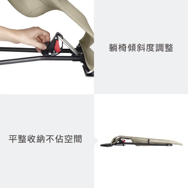 搖椅模式(最高9公斤):請始終使用安全帶並確保兩個按鈕鎖定。可在兩個位置間調整。當寶寶能獨立坐起時,請停止使用搖椅功能。