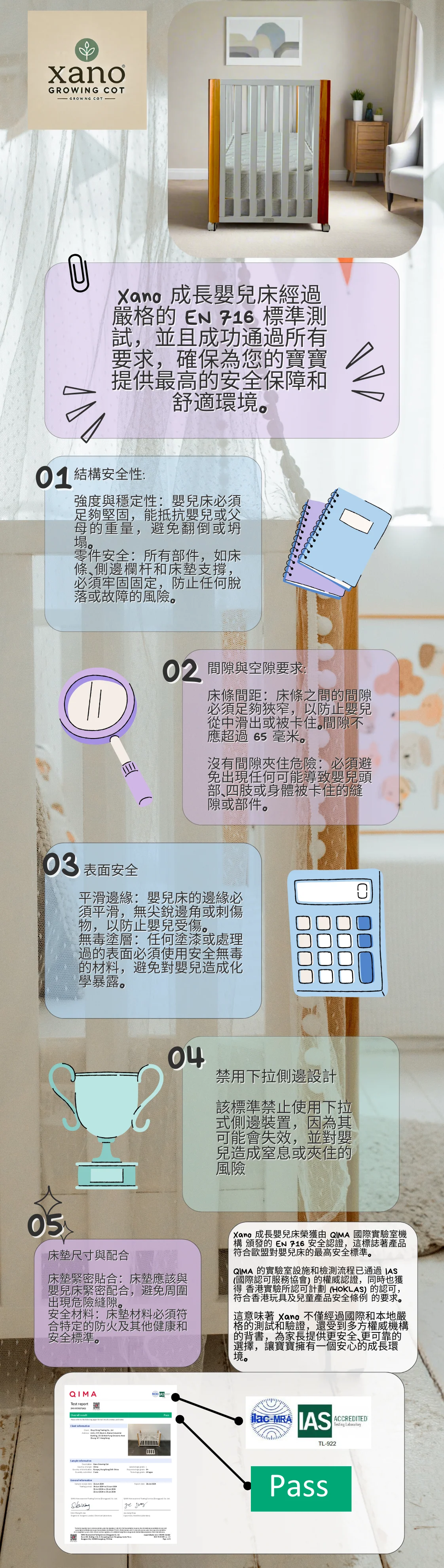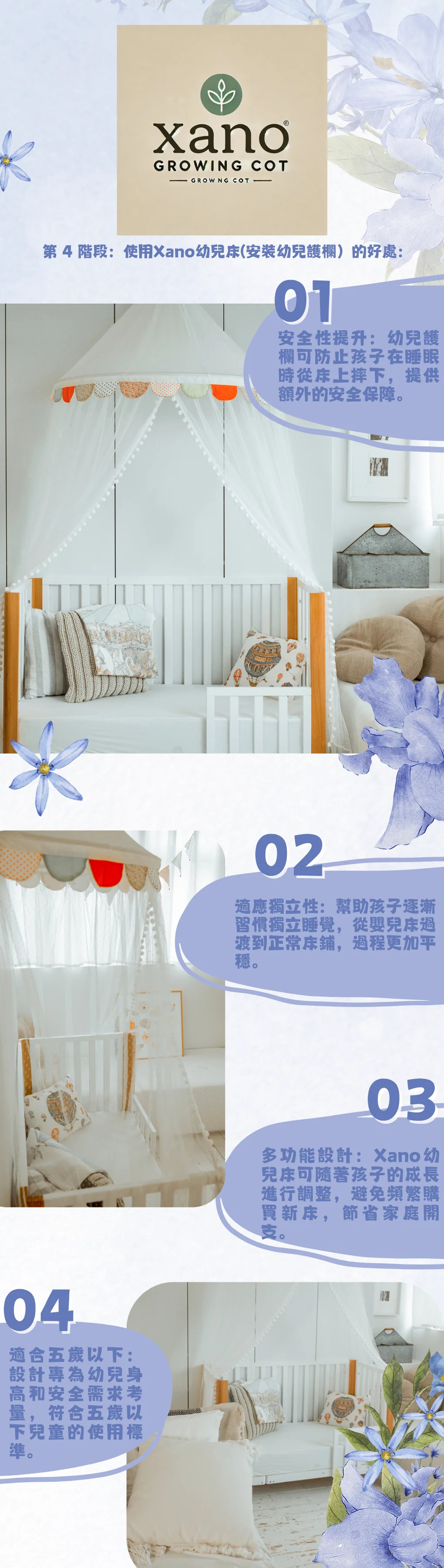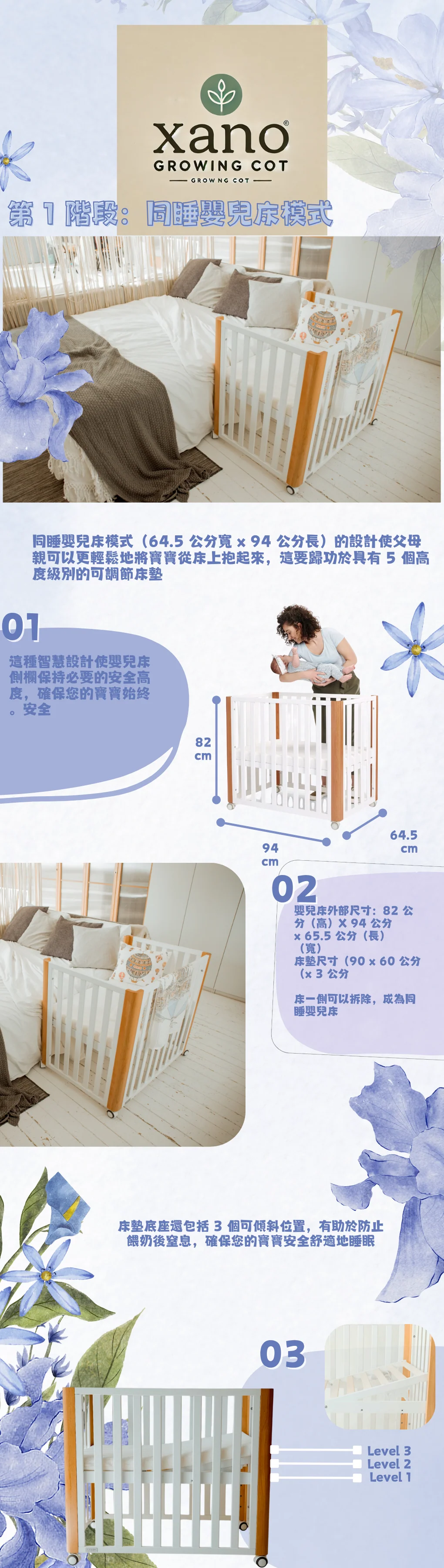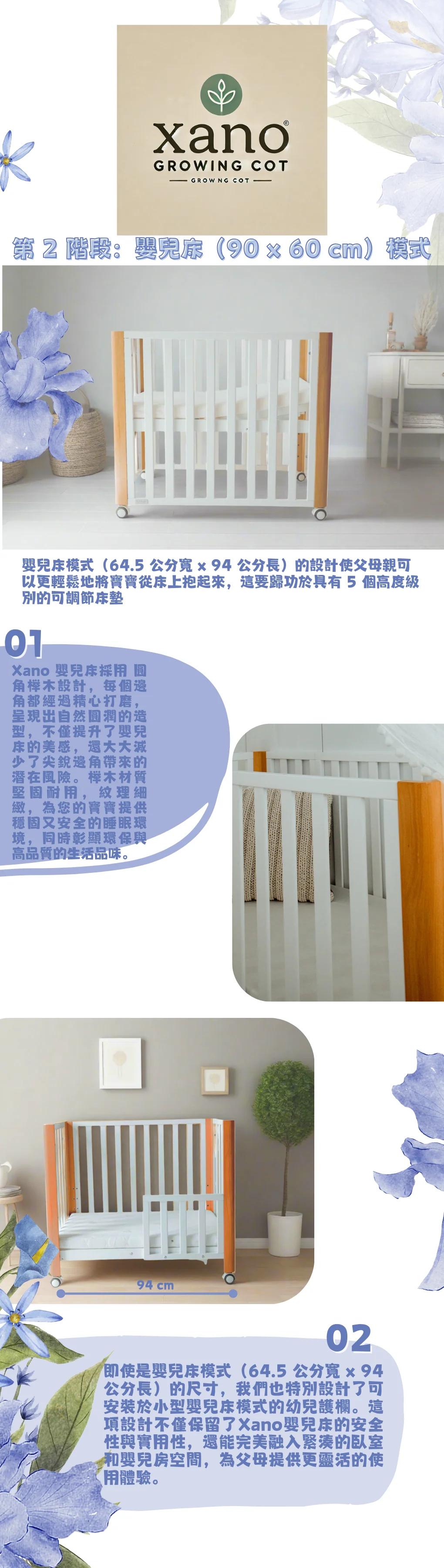 Xano成長嬰兒床能隨寶寶需求轉變,提供舒適、安全的睡眠環境。以下是其多功能模式: