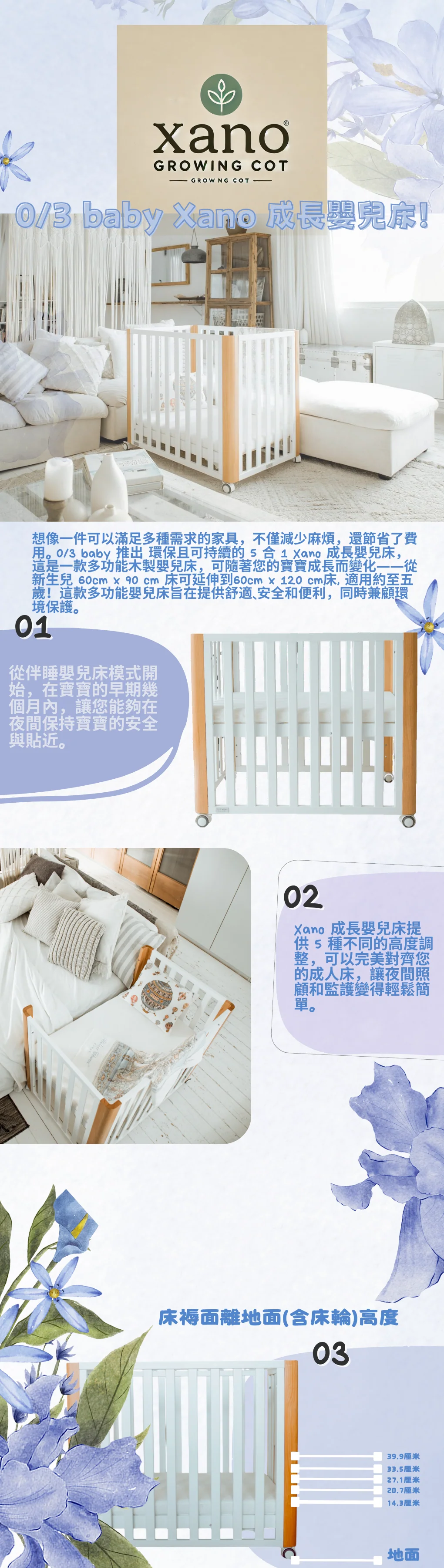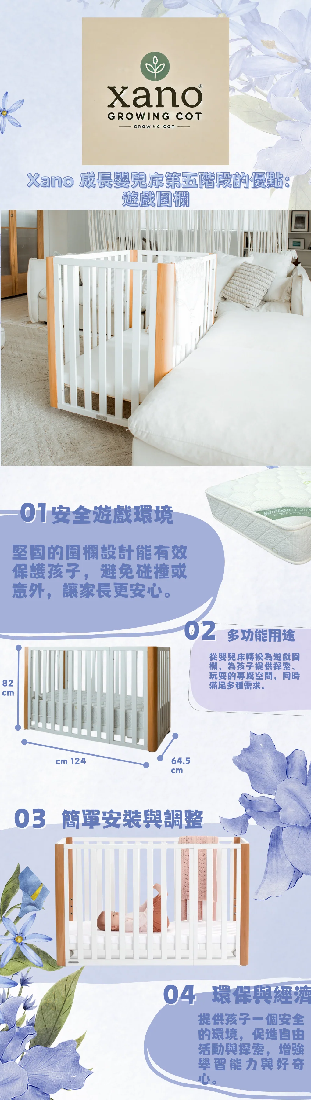 Xano 5合1成長嬰兒床是環保多功能嬰兒家具,能從床邊嬰兒床轉變成全尺寸嬰兒床、幼兒床或遊戲圍欄,適合新生兒至五歲幼兒。固定側邊設計確保安全,配備可調高度與輪子,便利父母日常使用。材質為進口櫸木與松木,性價比高,節省空間與費用。