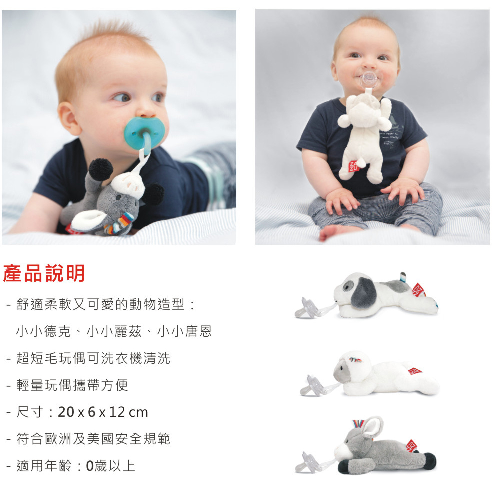 Dexy,Lizzy或Donny幾乎可以輕鬆附著在任何奶嘴上。 柔軟的面料讓寶寶盡情享受。 腿完全適合小手。